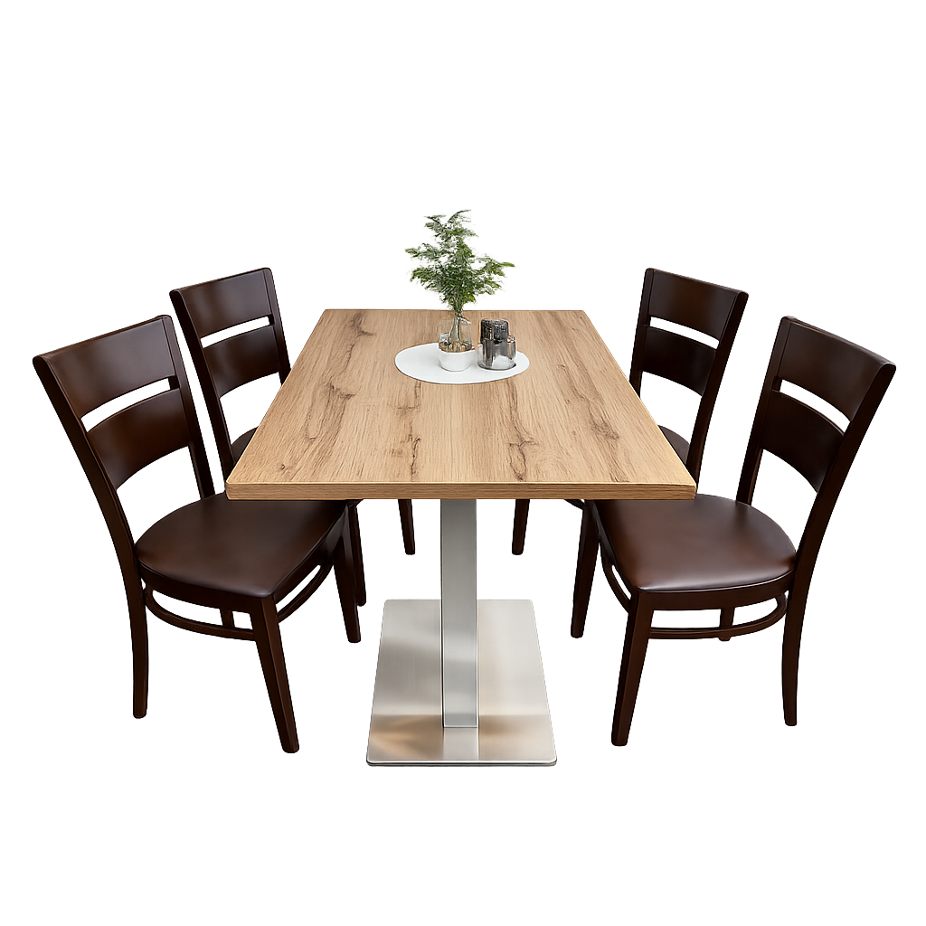 Diese professionelle Restaurant-Sitzgruppe (auch Restaurantgarnitur oder Sitzgruppe genannt) ist die perfekte Lösung für Gastronomie, Restaurant, Bistro, Café, Bar oder Hotel. Die Kombination aus stabilem Tisch mit Gußeisentischbein und vier komfortablen Massivholzstühlen vereint Langlebigkeit, Funktionalität und ein zeitloses Design – ideal für den täglichen, intensiven Einsatz im gewerblichen Bereich.