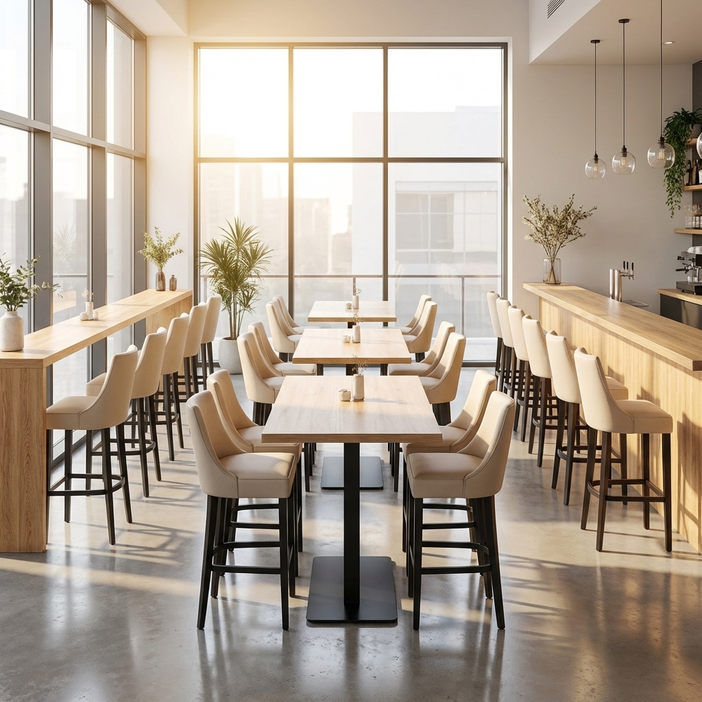Restaurant barkruk Finja rugleuning en zitting bekleed met imitatieleer in de kleur bruin en heeft een licht gebogen rugleuning zodat hij een geweldig zitcomfort biedt. Scheurbestendig imitatieleer met een dikke laag imitatieleer in 1 mm met schuimdichtheid 35 RG met zeer stevige hoeken die niet knikken.