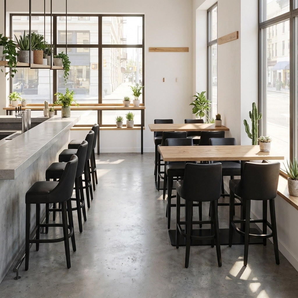 Restaurant barkruk Finja rugleuning en zitting bekleed met imitatieleer in de kleur bruin en heeft een licht gebogen rugleuning zodat hij een geweldig zitcomfort biedt. Scheurbestendig imitatieleer met een dikke laag imitatieleer in 1 mm met schuimdichtheid 35 RG met zeer stevige hoeken die niet knikken.